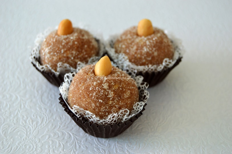 cajuzinho. Tem muita criança que torce a cara quando vê o cajuzinho porque acha que literalmente é de caju. O nome desse doce foi dado pelo formato em que ele era tradicionalmente feito e lembrava a fruta. Aqui na cozinha nós fazemos redondinho e com flocos de amendoim que deixam ele bem elegante. A receita é segredo de família, mas a pedida é usar amendoim torrado e moído para dar o sabor intenso do doce.